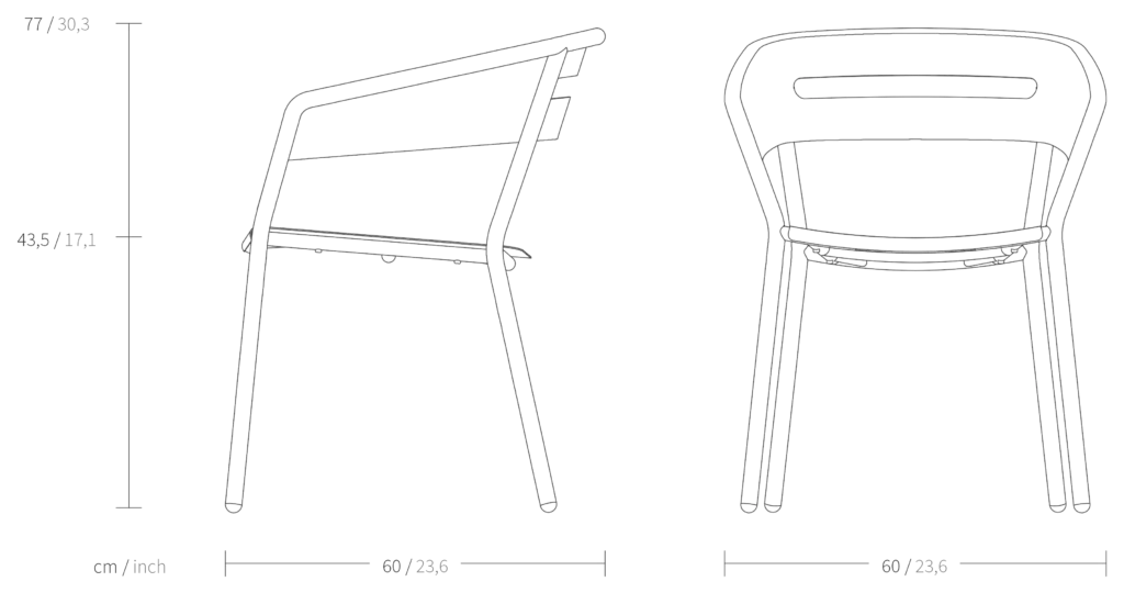 Gestell aus pulverbeschichtetem Aluminium, Sitz aus naturbelassenem Teakholz aus FSC-zertifizierter Forstwirtschaft.